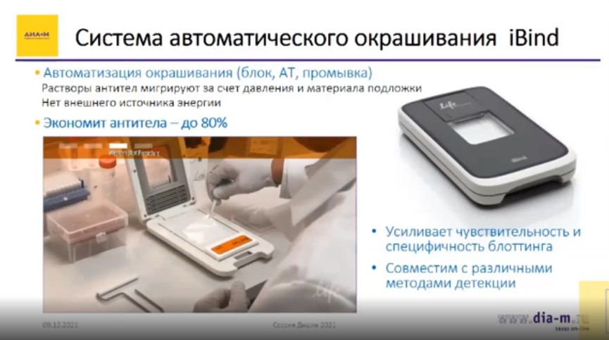 Преимущества системы автоматического окрашивания iBind в том, что при автоматизированном окрашивании растворы антител мигрируют за счет давления и материала подложки без применения внешнего источника энергии. Применение устройства, совместимого с различными системами детекции, не только позволяет экономить до 80% антител, но и усиливает специфичность и чувствительность блоттинга.