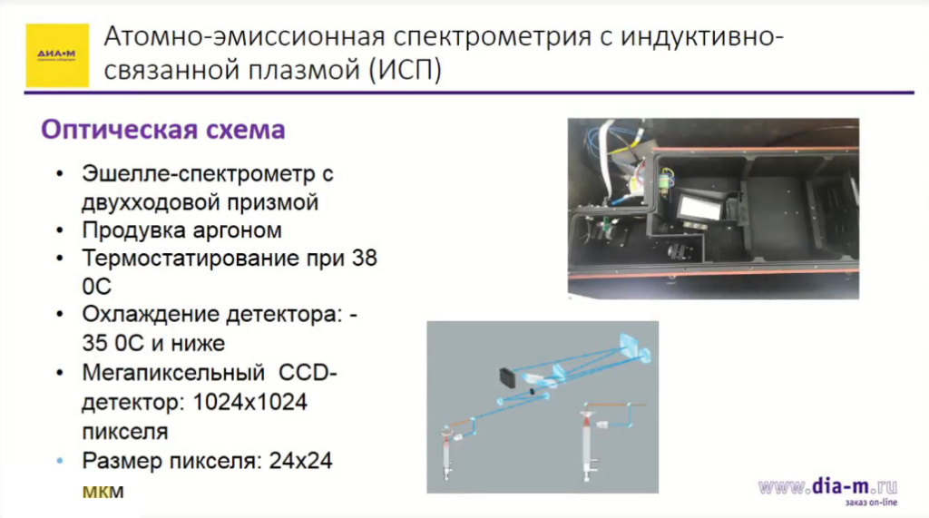 На слайде внизу приведена принципиальная оптическая схема, наверху – фото, отображающее, как эта схема выглядит в реальности. Она очень напоминает оптические схемы спектрометров Agilent, которые сами по себе очень классные – настолько, что сам факт реализации в спектрометре NCS похожей оптической схемы дает основания даже без личного осмотра и тестирования прибора утверждать, что это очень надежный инструмент.Атомно-эмиссионная спектрометрия с индуктивно-связанной плазмой (ИСП)-5