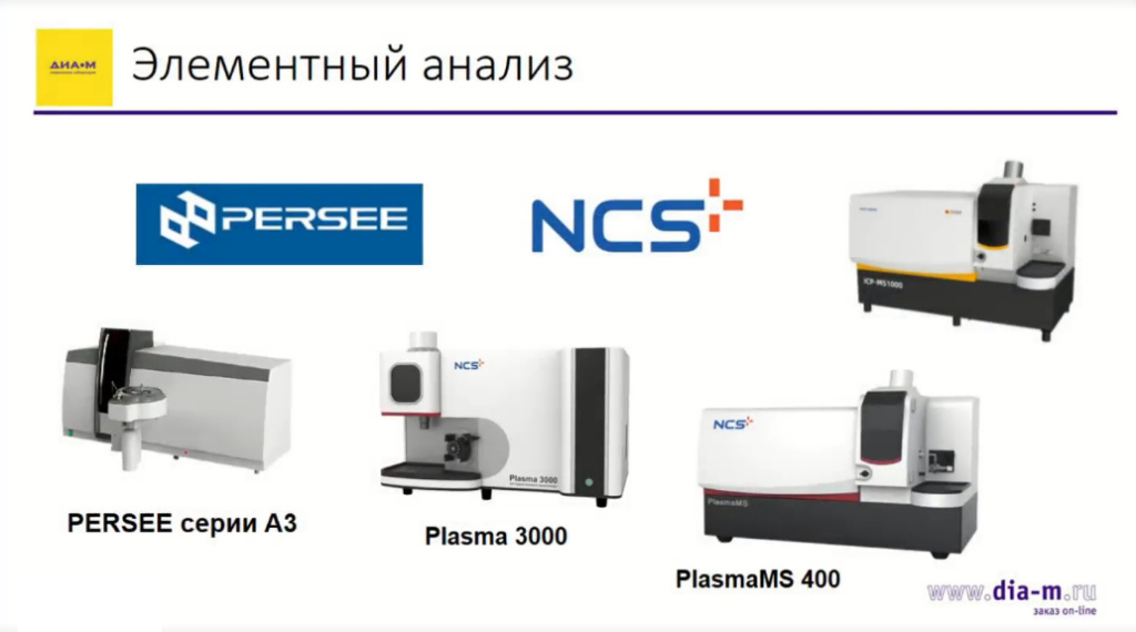 Масс-спектрометры NCS компания «Диаэм» тоже предлагает – главным образом совместную модель c HeXin ISP-MS1000, так как у компании есть соответствующий дистрибьюторский договор. По сути обе модели, изображенные на слайде – от HeXin и NCS – это одинаковые модели, хотя некоторые преимущества есть у первой.
