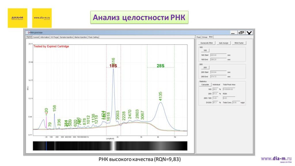 На следующем изображении этот индекс пониже – около 7, и по идее это нужно рассматривать как признак РНК низкого качества. Но недавно, показывая эти результаты в Томске, автор вебинара выяснил, что в принципе специалисты, которые занимаются там исследованием РНК, готовы работать и при наличии РНК с таким индексом – для них это нормально, это дело опыта.Анализ целостности РНК-2