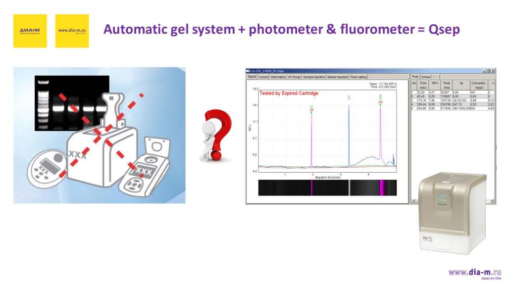 Еще одно из применений Qsep – электрофорез белков. На представленном приборе это получается лучше, чем обычный форез в полиакриламидных гелях: во-первых, здесь происходят и анализ, и детекция внутри картриджа, во-вторых – происходит автоматическая обработка результата, а результат виден на экране – результаты обработки свечения флуоресценции. Здесь более высокое разрешение, как заявляет производитель, чем это будет при форезе в обычной форезной камере.