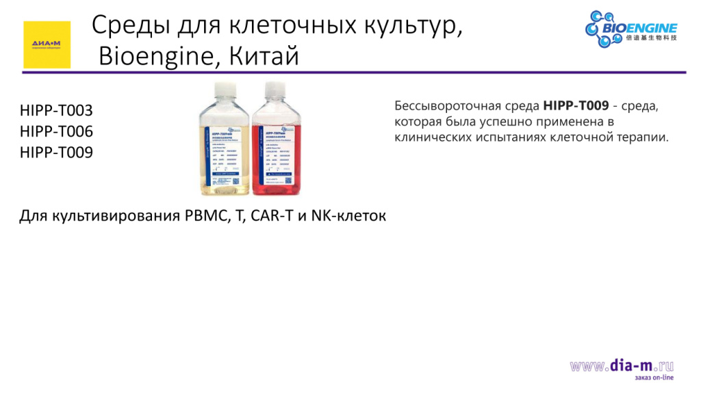 В частности это бессывороточная среда HIPP T009, которая используется в клинических испытаниях для создания широкого спектра клеток: иммунных – Т-клеток, NK-клеток, CAR-T, CIK, CAR-NK-92, гемопоэтических стволовых клеток (CD34+) и многих других (NK-92, NK-92MI, K562, Jurkat и пр.). Эта среда не просто была создана компанией – она была включена в клинические испытания и успешно их прошла, зарекомендовав себя как очень надежная.