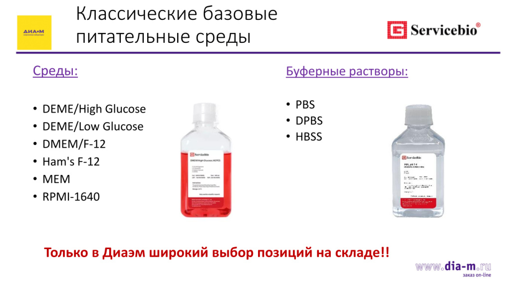 Servicebio (Wuhan Servicebio Technology, Китай)– это компания, уже имеющая мировую известность. Основанная в 2007 г., она занимается производством реагентов для life science, причем не только сред, но и антител, реагентов для клеточной и молекулярной биологии, а также различного оборудования, пластика и расходных материалов. Ее репутация по всему миру позволяет доверять этой компании: все виды реагентов, питательных сред и буферов, производимые ею, выпускаются под строгим контролем качества и получили высокую оценку крупных НИИ во всем мире. Потому среды производства этой компании «Диаэм» предлагает своим клиентам как основные базовые среды для работы с культурами клеток. Их запас постоянно поддерживается на складе «Диаэм».
