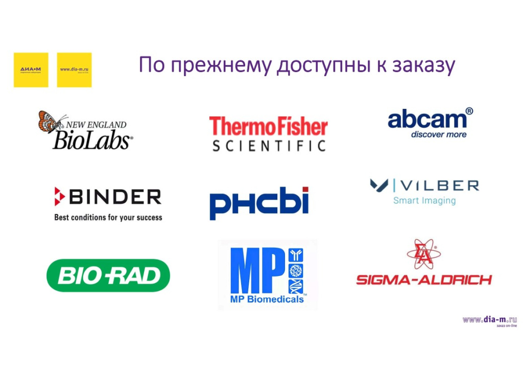 В настоящее время «Диаэм» по-прежнему продолжает поставлять продукцию знакомых пользователям западных производителей: на слайде приведены логотипы лишь некоторых из них, например, New England Biolabs, ThermoFisher Scientific, Abcam, Binder, Vilber, PHCbi, Bio-Rad, MP Biomedicals, Sigma-Aldrich. Все они продолжают работать на территории России.