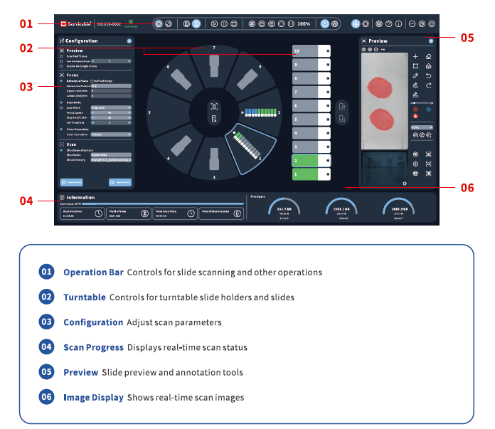Сканер LG-S80 представляет собой передовое устройство для автоматического сканирования предметных стекол с биологическими образцами. Основная особенность LG-S80 заключается в его способности автоматически распознавать форму ткани и сканировать только активные области, что значительно ускоряет процесс и повышает эффективность работы. Устройство поддерживает работу с различными типами окрашивания, включая окраску гематоксилином и эозином, иммуногистохимическую (IHC) окраску, цитологические тесты (TCT), биопсии костного мозга, замороженные срезы, микромассивы тканей (TMA), иммунофлуоресцентные срезы (вариант прибора арт. LG-FS80), FISH-окрашенные срезы и специальные окрашивания. Это делает его универсальным решением для широкого спектра исследовательских задач.