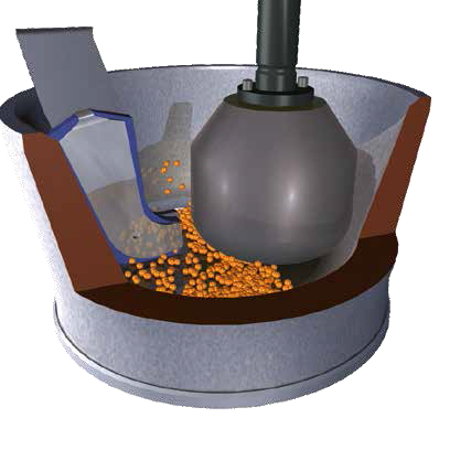 Cтупки измельчают, перемешивают и истирают давлением и трением. Функцией скребка является подача материала в область между ступкой и пестом. Эта принудительная подача гарантирует, что весь материал непрерывно измельчается и истирается, а также интенсивно перемешивается. Пест расположен не в центре, а смещен, контакт с вращающейся ступкой и материалом заставляет его вращаться автоматически. Необходимое давление измельчения достигается за счет веса самого песта и регулируемого давления пружины, действующей на ось песта.
