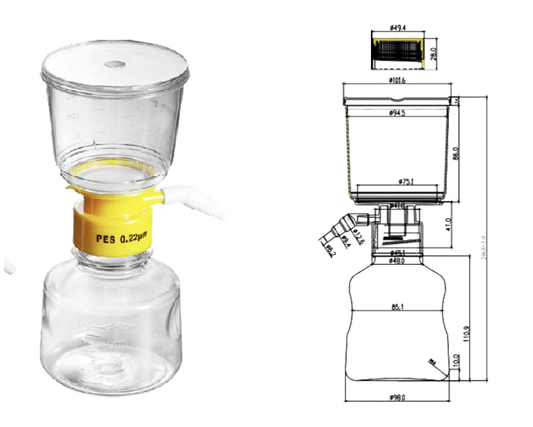 Комплект поставки: фильтр-воронка, встроенный фильтродержатель с мембраной, встроенный боковой вакуумный коннектор и приёмная бутыль.