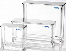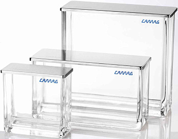 В данной камере ВЭТСХ-пластины можно элюировать с 2 противоположных сторон, что позволяет удвоить число треков по сравнению с обычной камерой, если дистанция элюирования не превышает 45 мм, т.e. 50 мм минус 5 мм от края пластины. Также можно элюировать, как в обычной конфигурации, так и в режиме «сэндвич»; пригодна для работы со всеми типами растворителей для ТСХ.