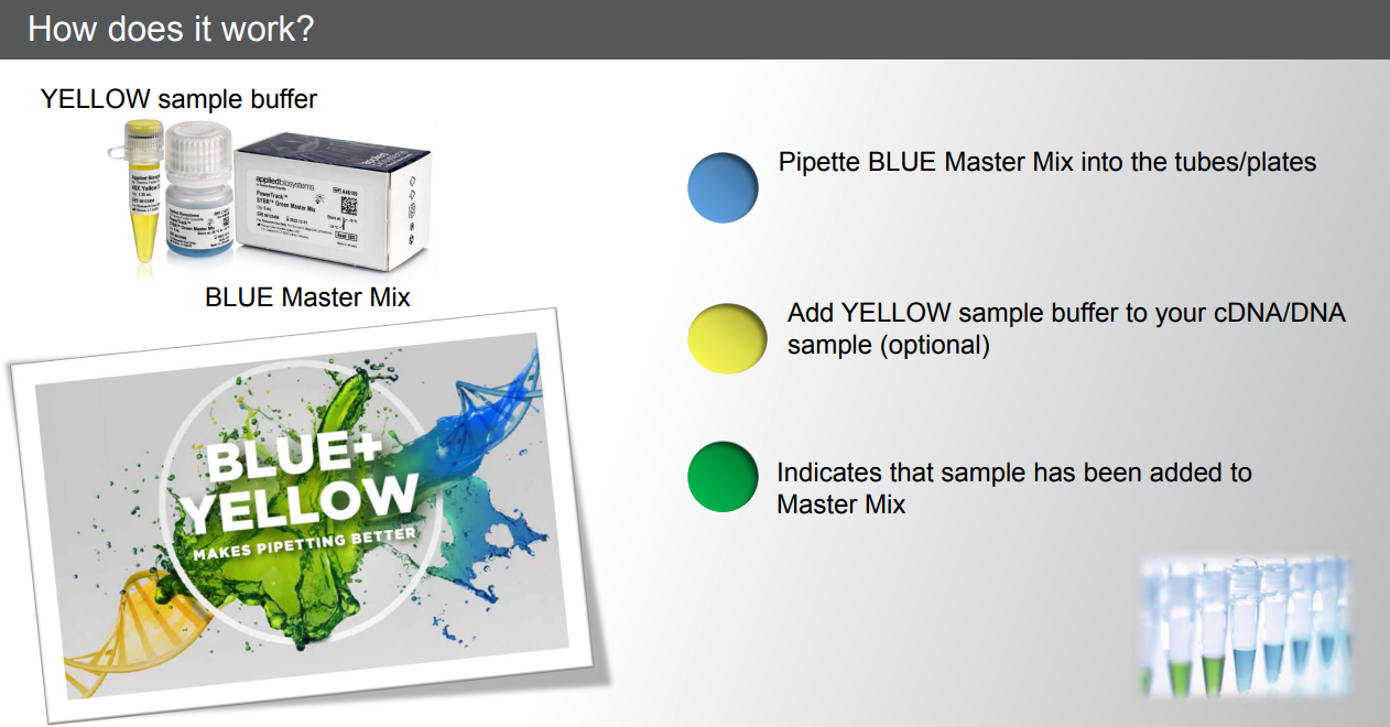 Мастер-микс PowerTrack SYBR Green это готовая оптимизированная, универсальная, 2-кратная смесь для проведения ПЦР в режиме реального времени. Мастер-микс содержит визуальный индикатор на основе синего красителя, который позволяет пользователю подтвердить, что образец был добавлен в реакционную смесь, тем самым минимизируя ошибки пипетирования. Опционно желтый буфер может быть добавлен к матрице (кДНК/ДНК), и при смешивании мастер-микса содержащего синий краситель и матрицы, предварительно смешанной с желтым буфером, реакционная смесь меняет цвет на зеленый, тем самым показывая, что матрица была добавлена в ПЦР-смесь.