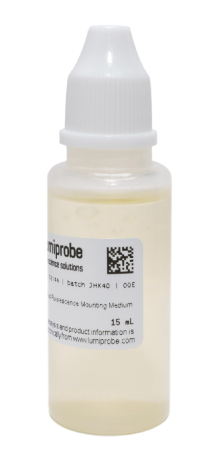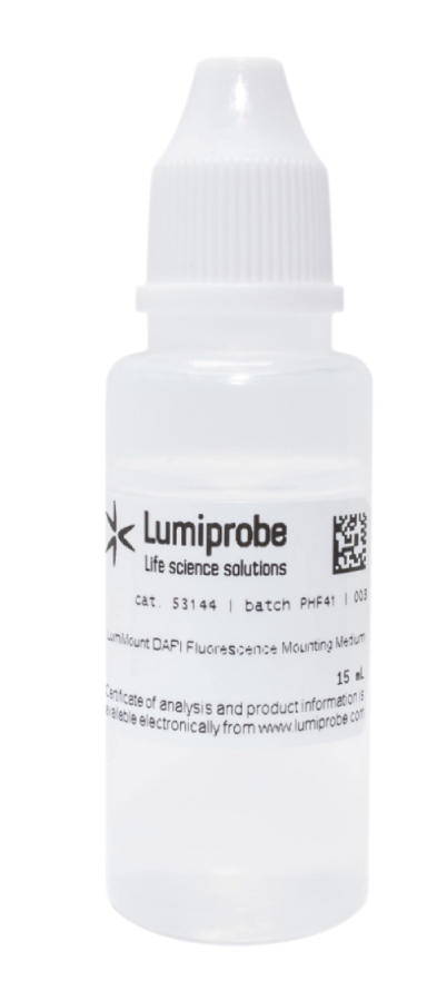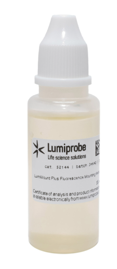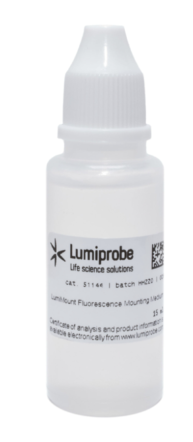 LumiMount — это готовая к использованию монтирующая среда на водной основе, предназначенная для надёжной герметизации флуоресцентно меченых клеточных и тканевых препаратов перед микроскопией. Среда содержит специальные компоненты, замедляющие фотобелинг флуорохромов, что позволяет сохранять яркость сигнала в течение всего сеанса визуализации и при повторных просмотрах.