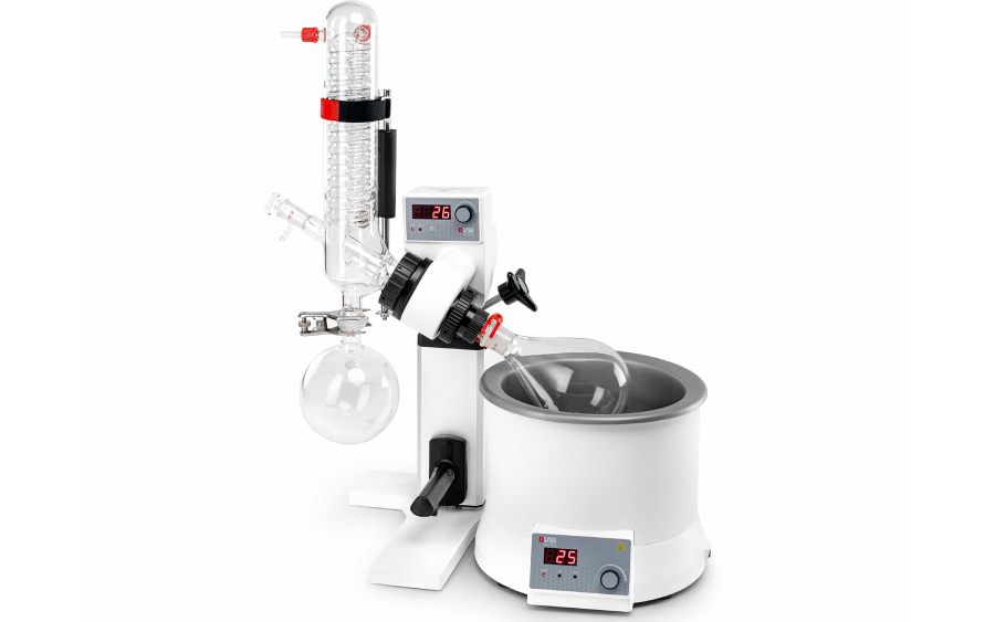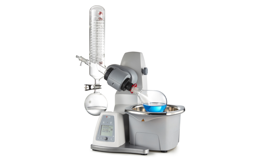 Ротационный испаритель RE100-Pro (аналог RV 3 V) является автоматической моделью с объёмом бани 5 литров и большим диапазоном температур до 180 °С. Благодаря специально сконструированным стеклянным направляющим, вертикальный конденсатор эффективно использует охлаждающую поверхность площадью 1000 см². Цифровой дисплей скорости вращения и температуры нагрева позволяет оптимально контролировать все процессы дистилляции. Запатентованное уплотнительное кольцо с двойной пружиной, изготовленное из ПТФЭ, обеспечивает превосходное уплотнение. Характеристики ротационного испарителя RE100-Pro