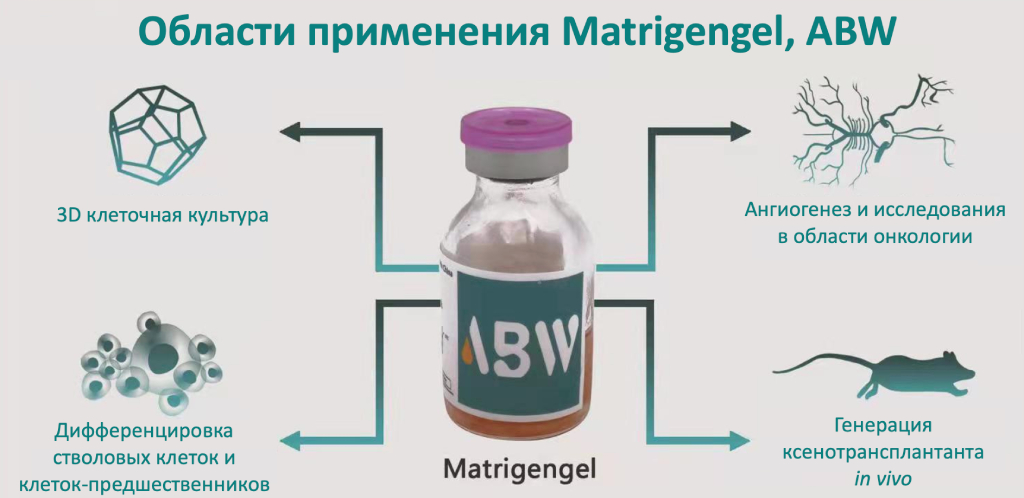 Внеклеточный матрикс ABW Matrigengel получают путем встраивания различных последовательностей генов, экспрессирующих коллаген, в иммортализованные линии опухолевых клеток мыши с помощью технологии редактирования генов и их извлечения из солидных опухолей. Его основными компонентами являются ламинин, коллаген IV типа, нидоген, гепаринсульфат гликопротеин, факторы роста и матриксные металлопротеиназы.