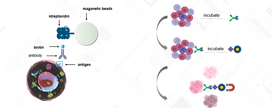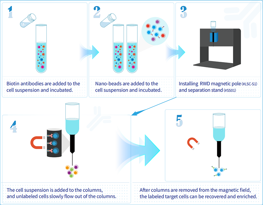 Принцип магнитной сепарации: колонка помещается в магнитное поле с высоким градиентом. Клетки с магнитной меткой остаются в колонке благодаря магнитной силе при прохождении через колонку, в то время как немеченые клетки вытекают, таким образом, достигая цели разделения или обогащения клеток. Отделенные клетки могут быть использованы для последующих экспериментов, таких как культивирование клеток, проточная цитометрия и т.д.