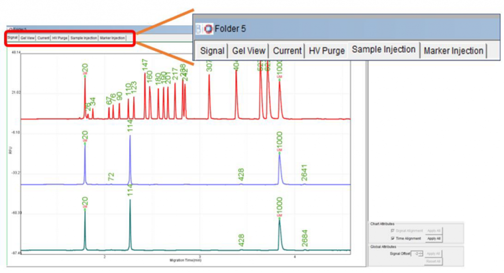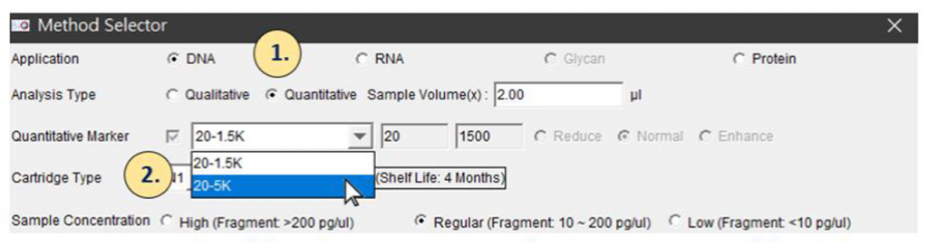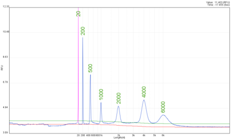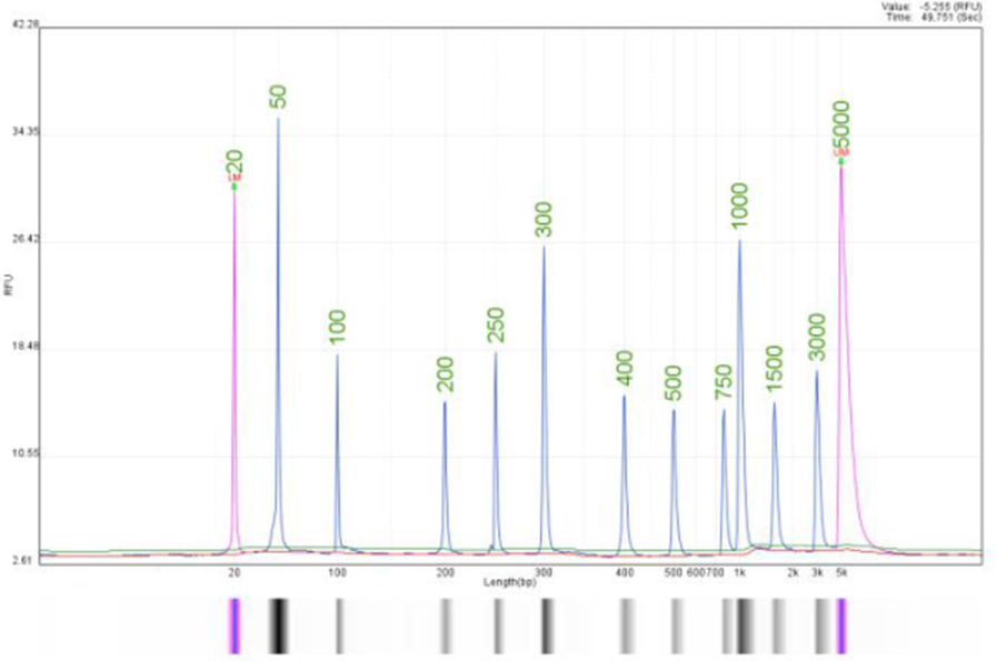 1. Поддержка нового размерного маркера Standard 50bp Ladder (C109301) (Рис.1). Размерный маркер C109301 спарен с выравнивающим маркером 20-5000bp (C109102-500A) ;и количественным маркером (C109102-500Q). Аналитический метод размерного маркера C109301 точно такой же, как у размерного маркера C109300, и адаптирован для всех наборов картриджей для ДНК.