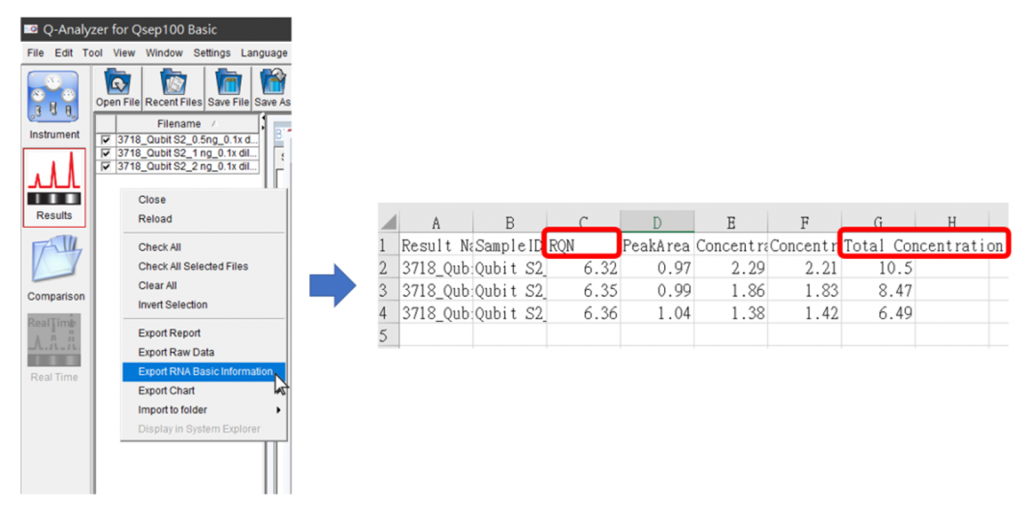 5. Поддержка экспорта информации о концентрации РНК и RQN в формате .csv (Рис.9). Пользователи могут экспортировать основную информацию о РНК в формате .csv, щелкнув правой кнопкой мыши список результатов. Файл CSV будет содержать основную информацию, включая RQN и концентрацию образца со всеми результатами.