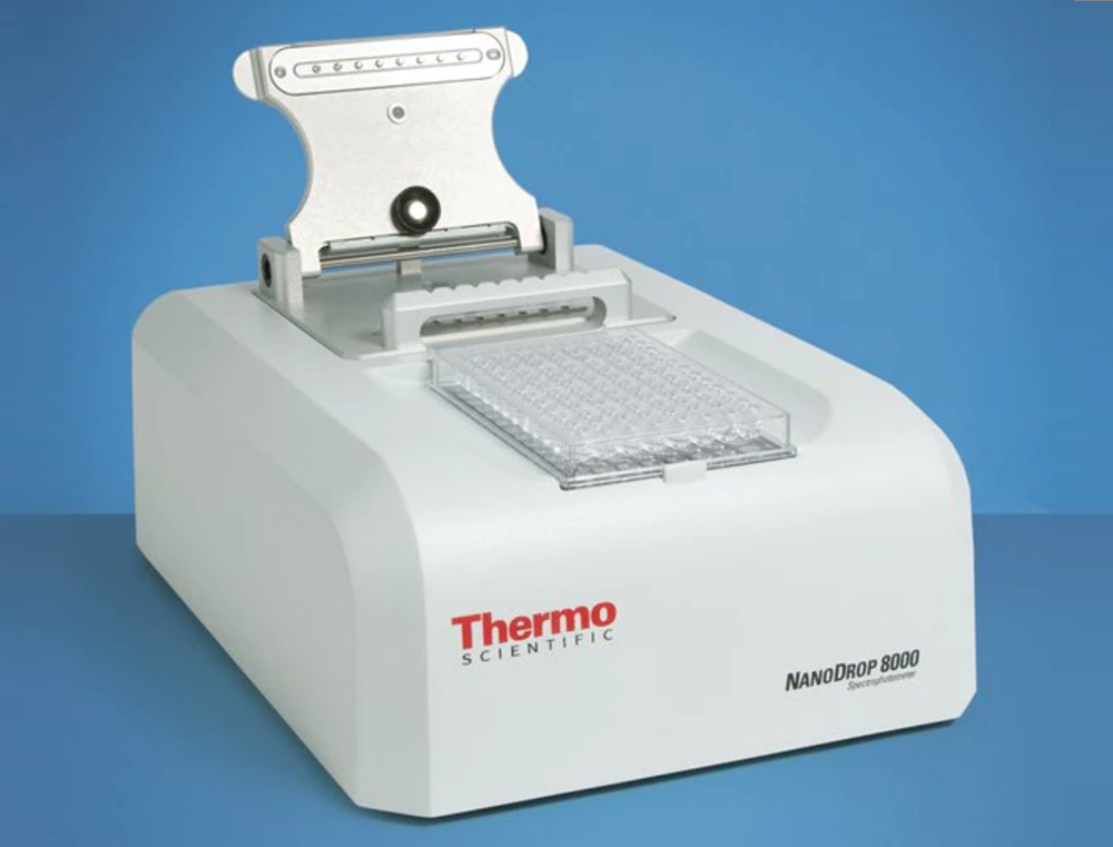 Для количественного анализа нуклеиновых кислот ДНК, РНК или белков фотометрическим методом Вам поможет такой помощник как NanoDrop 8000 для анализа сразу 8-ми образцов в микрообъеме. Преимущество этого прибора заключается в высокой пропускной способности при использовании всего 1-2 мкл образца. Также значительным плюсом данного оборудования является отсутствие необходимости пробоподготовки и покупки специальных красителей. Возможность получения информации о загрязняющих веществах (белки, фенол, соли гуанидина) можно считать как еще одно достоинство наноспектрофотометра. Недостатком данного оборудования является то, что прибор не делает различий между молекулами, которые измеряет (не различает чем именно загрязнена проба).