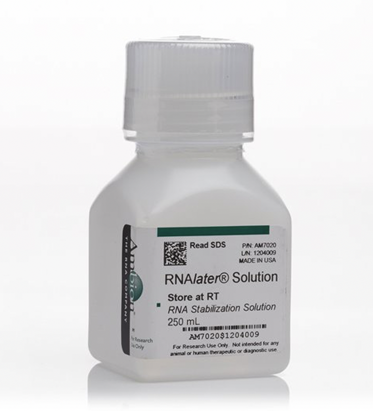 Раствор RNAlater применяется для стабилизации РНК в интактных, размороженных образцах тканей, устраняет необходимость немедленной обработки или замораживания образцов в жидком азоте для последующей обработки; сохраняет РНК 24 часа при температуре 37 °C, 1 неделю при комнатной температуре, 1 месяц при 4 °C, либо любой срок при -20 °C.